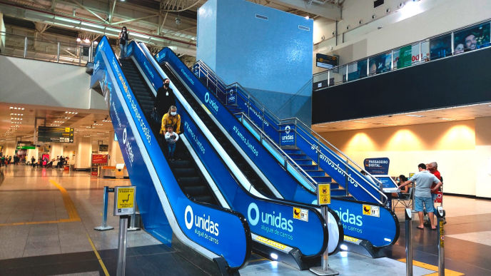 Presença dominante em escadas rolantes, check-in, elevadores e pontos de alto impacto;